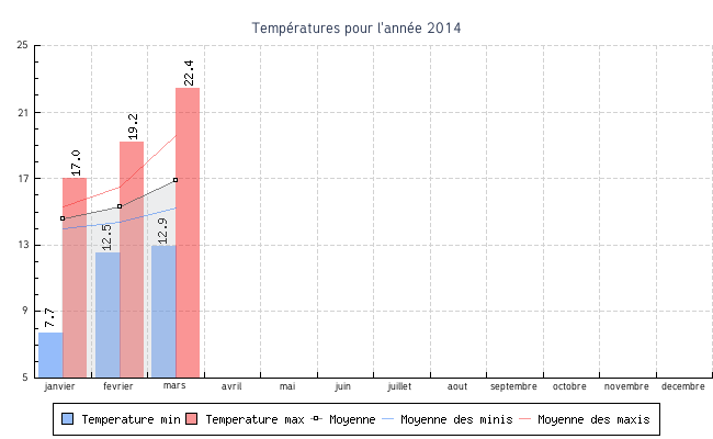 | janvier | 7.7 °C | 14.0 °C | 17.0 °C | 15.3 °C | 14.6 °C | 0.0 km/h | 0.0 km/h | O |
